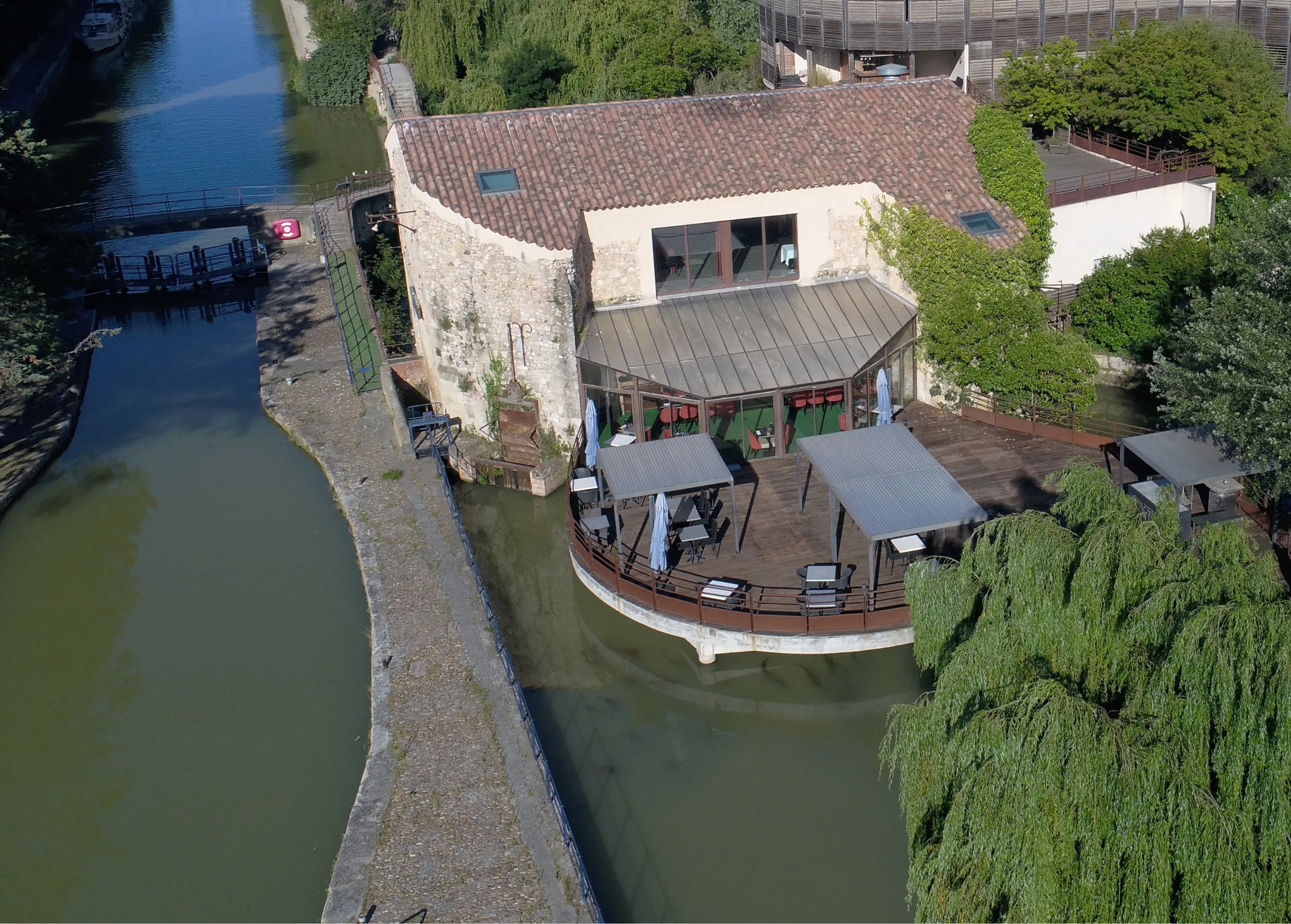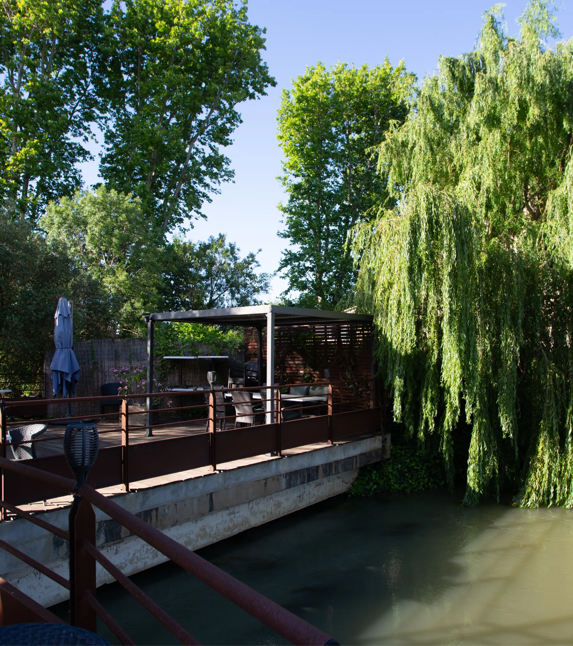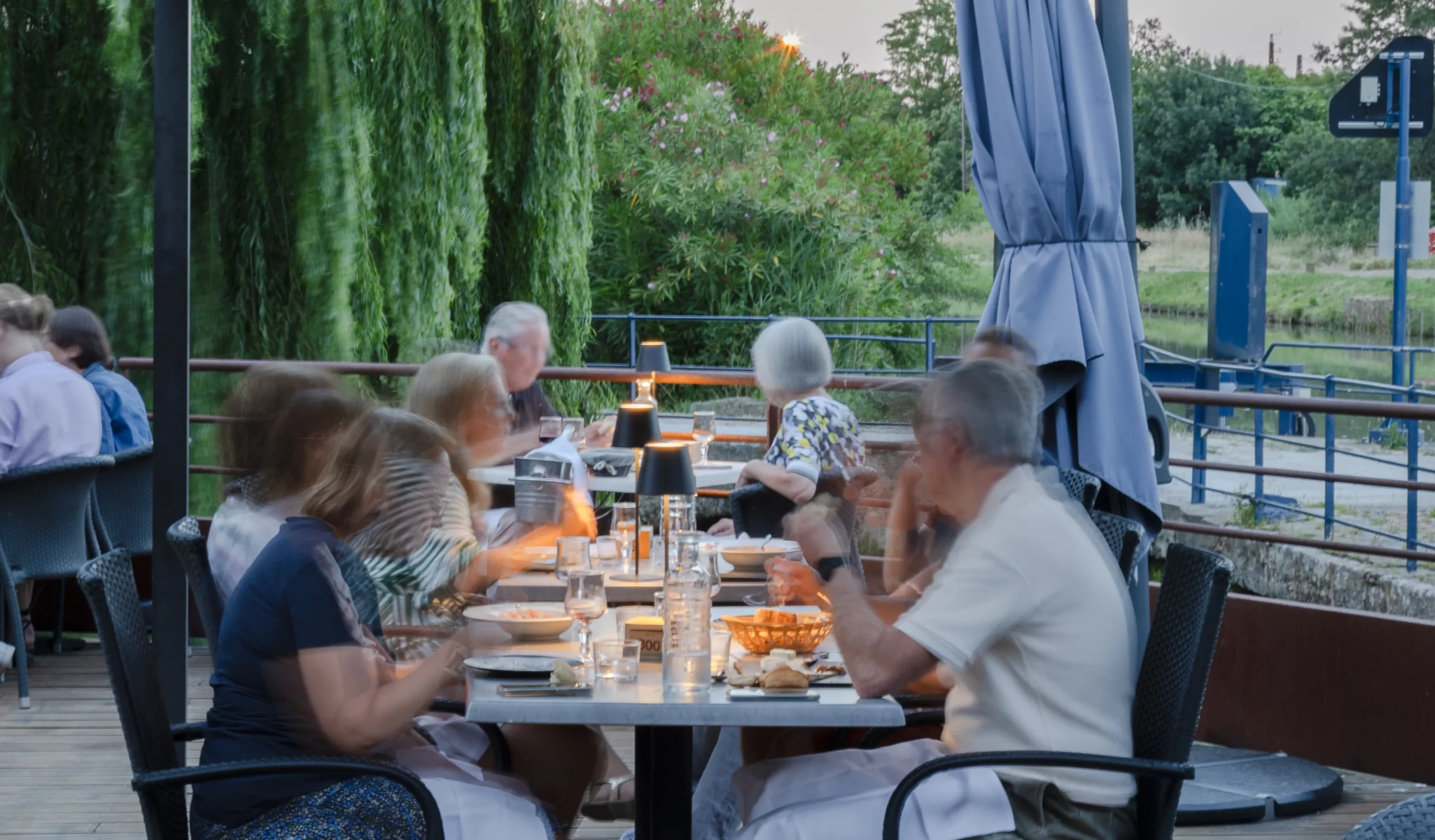 À l’ombre des pergolas, la grande terrasse de 150 m² s’ouvre sur le canal. Le midi, on y savoure fraîcheur, lumière et plats du jour. Le soir venu, l’éclairage tamisé prolonge l’enchantement. Les bateaux glissent lentement. Le temps, lui, semble suspendu.