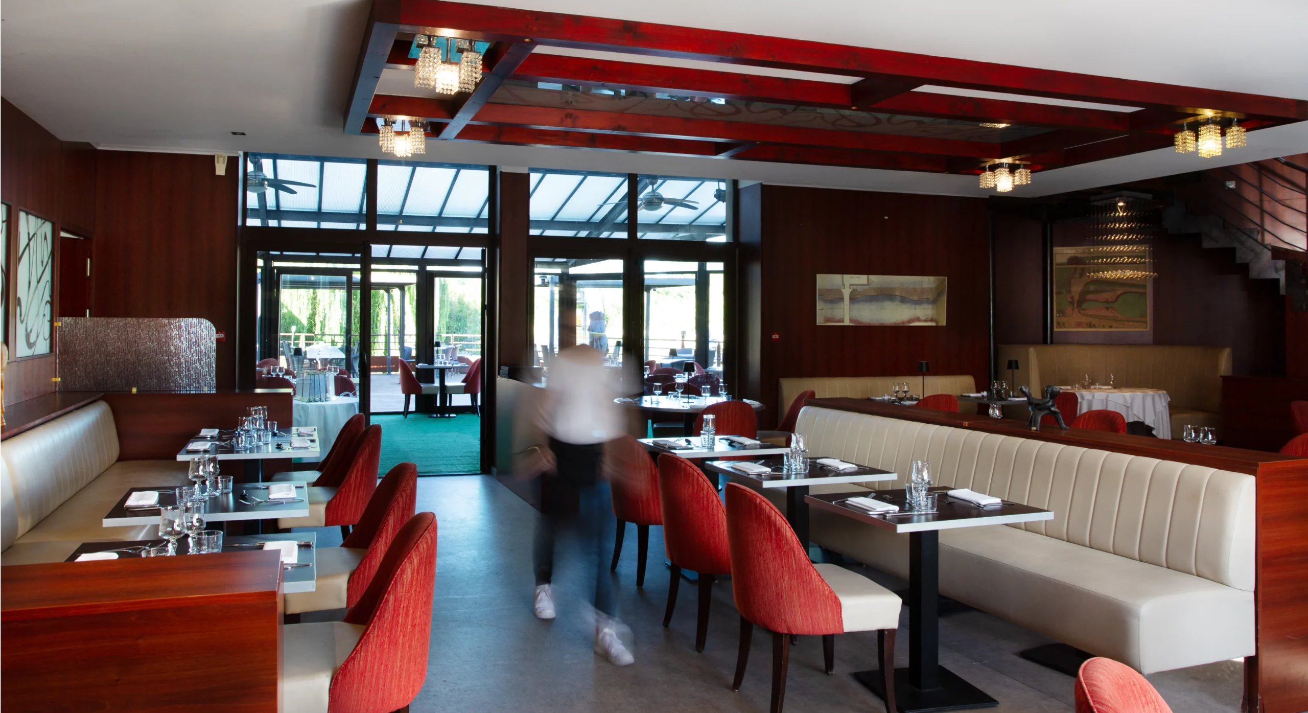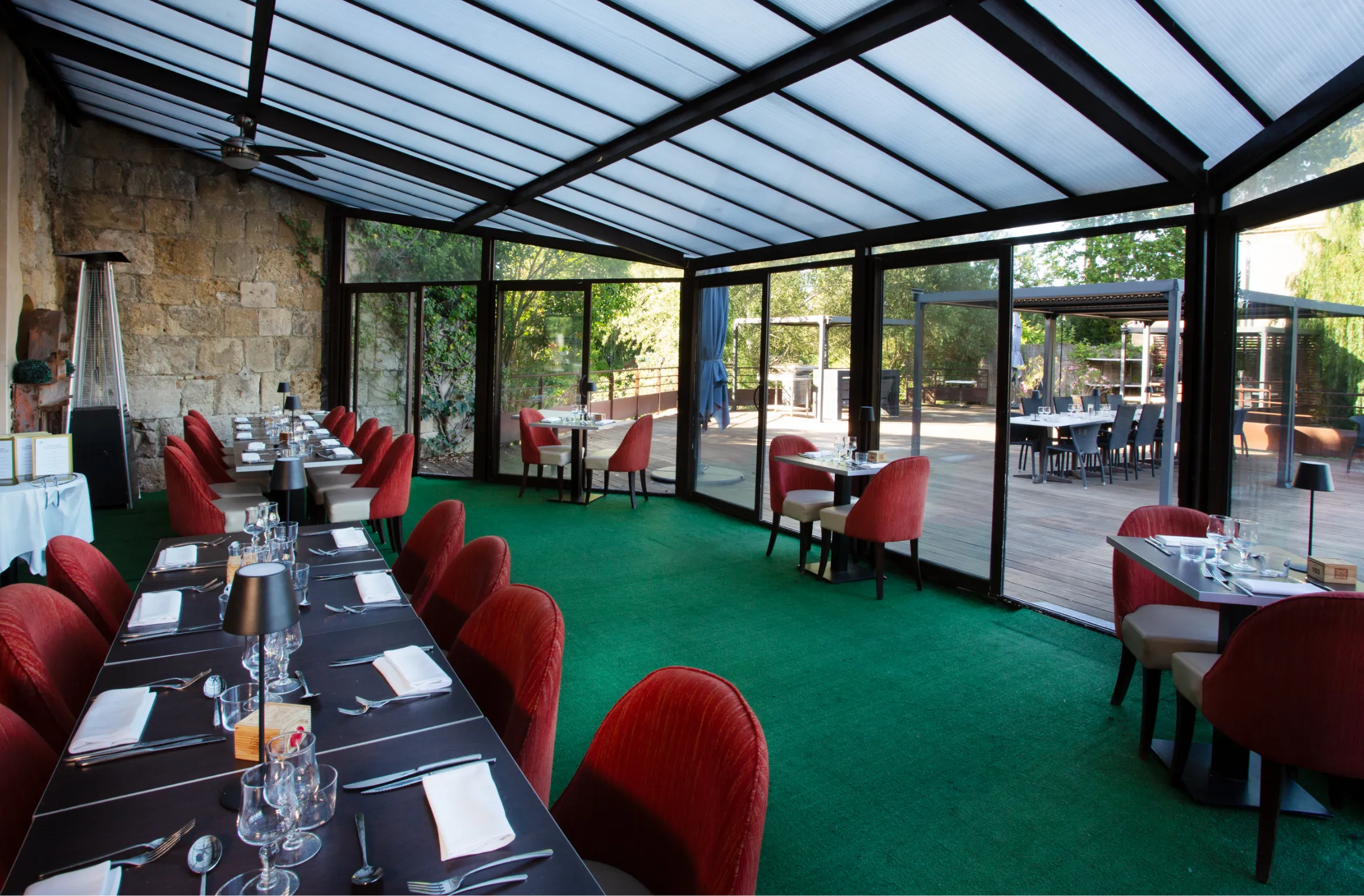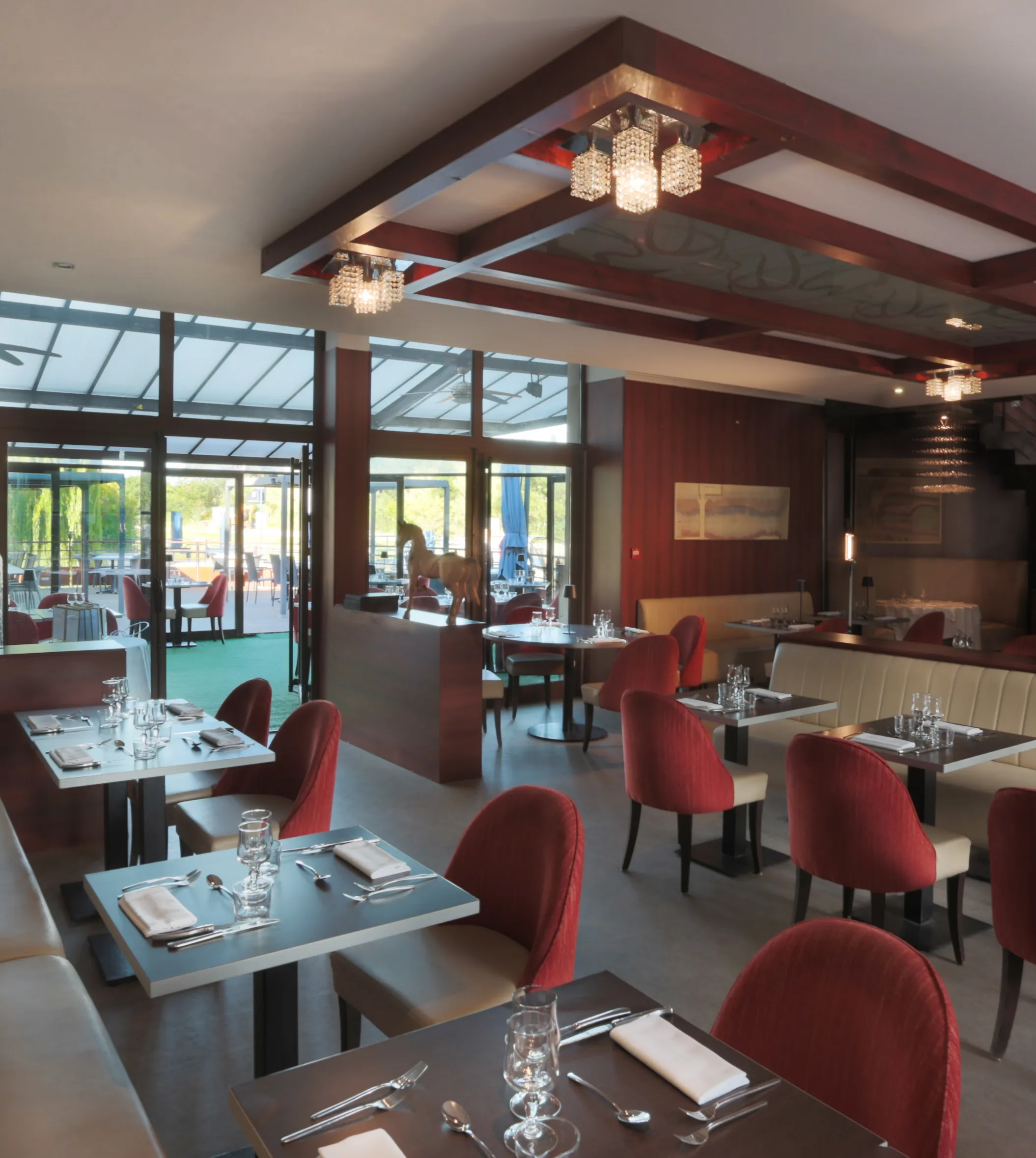 À l’ombre des pergolas, la grande terrasse de 150 m² s’ouvre sur le canal. Le midi, on y savoure fraîcheur, lumière et plats du jour. Le soir venu, l’éclairage tamisé prolonge l’enchantement. Les bateaux glissent lentement. Le temps, lui, semble suspendu.